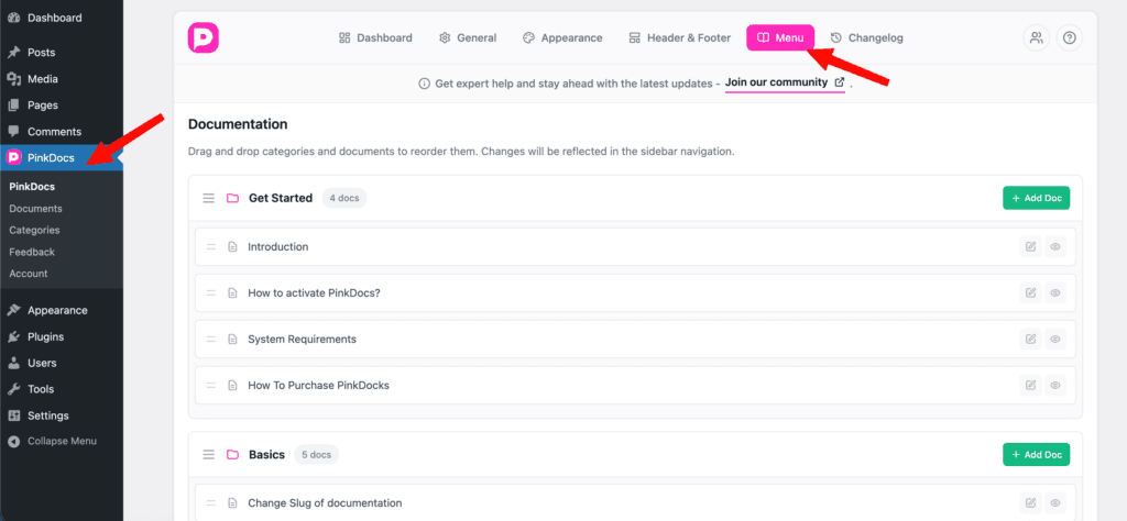 PinkDocs lets you control the order of your documentation using a simple drag and drop menu system.