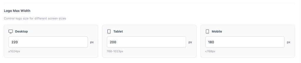 - Desktop (≥1024px): Set the maximum logo width for large screens (e.g. 220px).