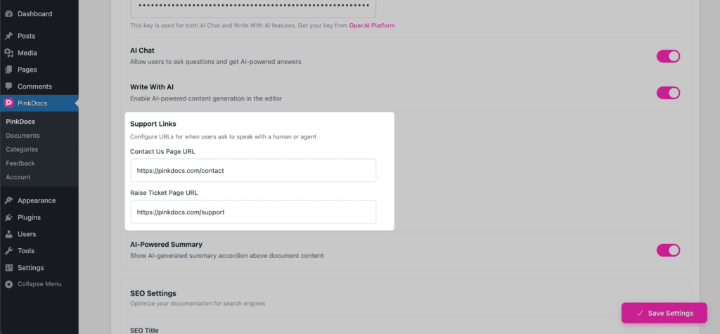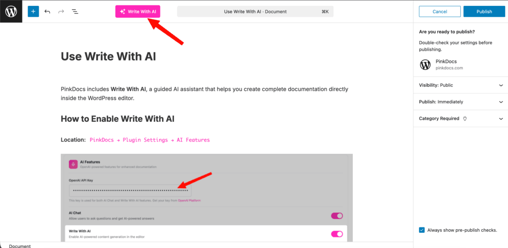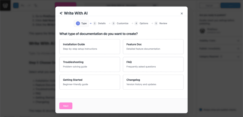 PinkDocs includes Write With AI, a guided AI assistant that helps you create complete documentation directly inside the WordPress editor.